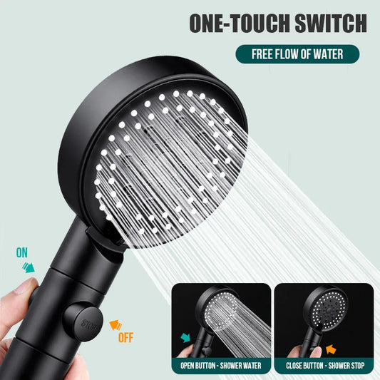 VEHHE New Black Shower Head Water Saving 5 Mode Adjustable Massage One-key Stop Button Shower High Pressure Bathroom Accessories